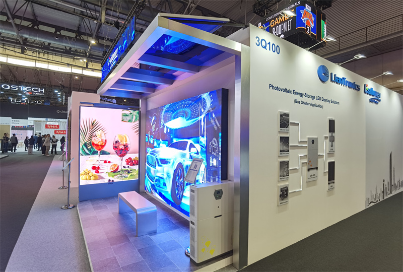 此次,华体会滚球登录 首次推出了光伏储能显示解决方案。采用HOB工艺,IP65防护等级,将光伏储能与LED广告机相结合。不仅可通过太阳能为广告机供电,还支持多种供电模式,大大降低了能耗和运营成本,实现了绿色、节能、高效的广告展示。